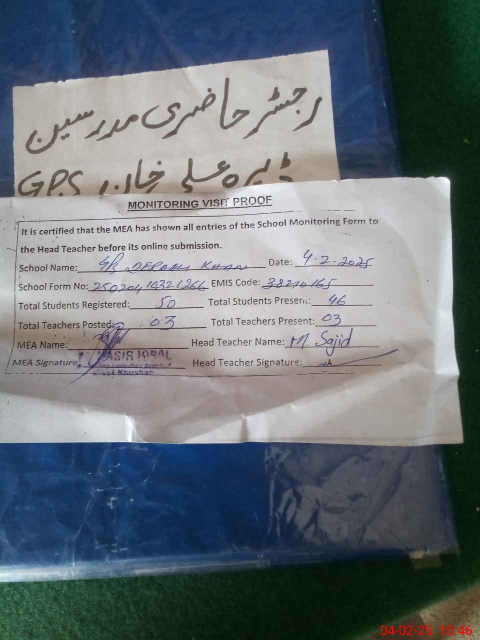 | EMIS Code: 38210165 | Name of School: GPS DERA ALI KHAN | |||