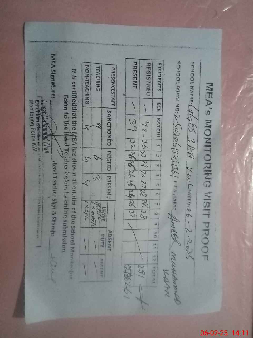 | Attendance Register | Head Teacher | MEA with School | Visit Proof |