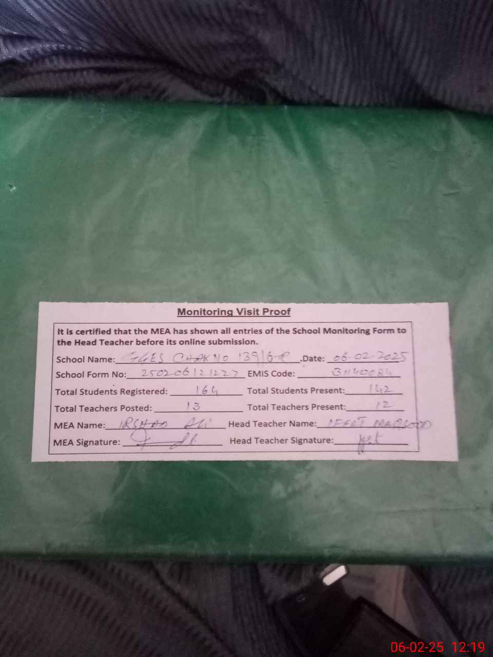 | Name: If**** Ma**** Designation: (School Headmaster's/Headmistress's) S.S.T.(Science) Phone/Cell Number: 03**** |
