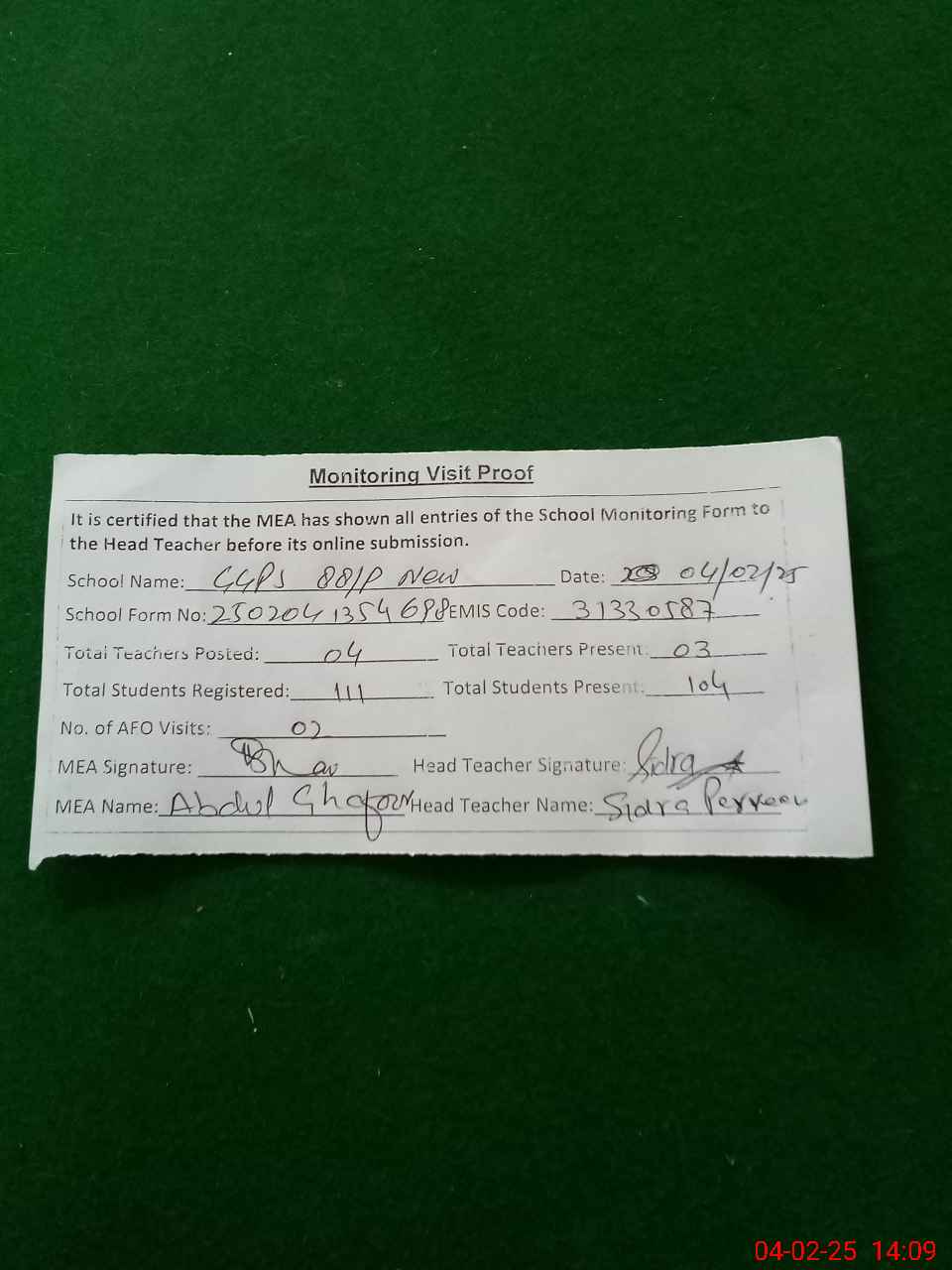 | EMIS Code: 31330587 | Name of School: GGPS 88/P NEW | |||