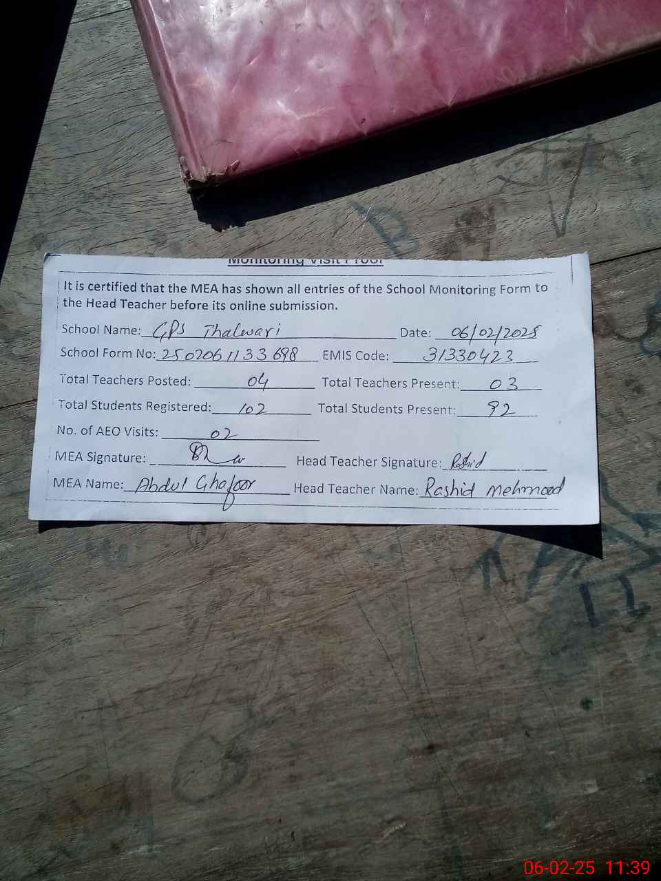| Attendance Register | Head Teacher | MEA with School | Visit Proof |