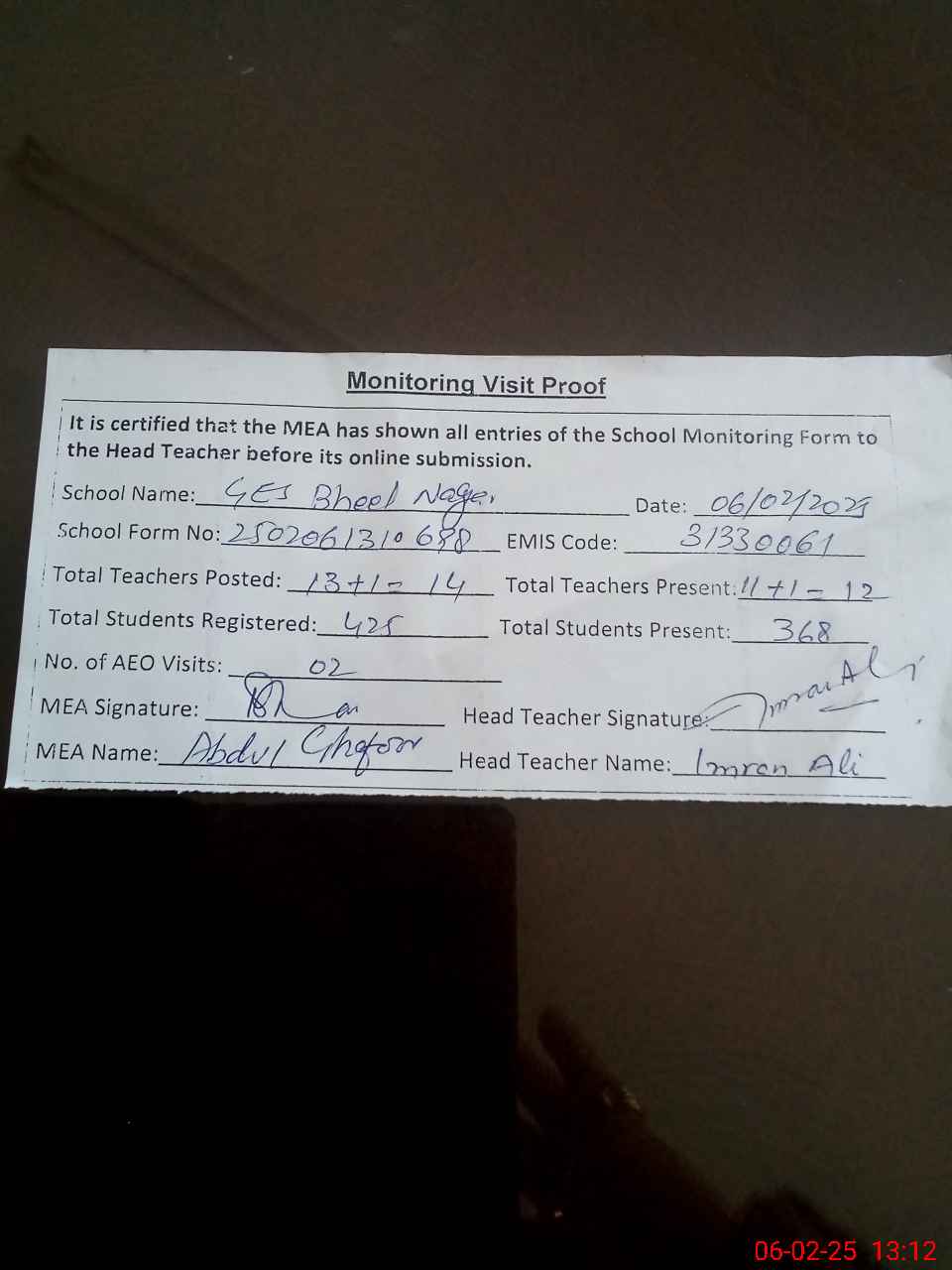 | Attendance Register | Head Teacher | MEA with School | Visit Proof |