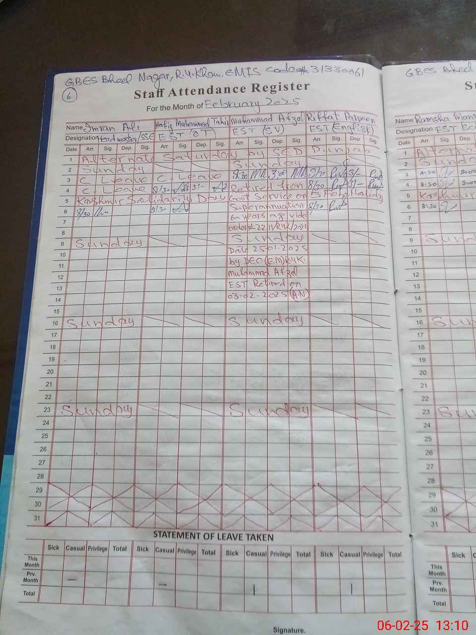 | CNIC | Full Name | Designation | R/C | Absence During Last Calender Month |