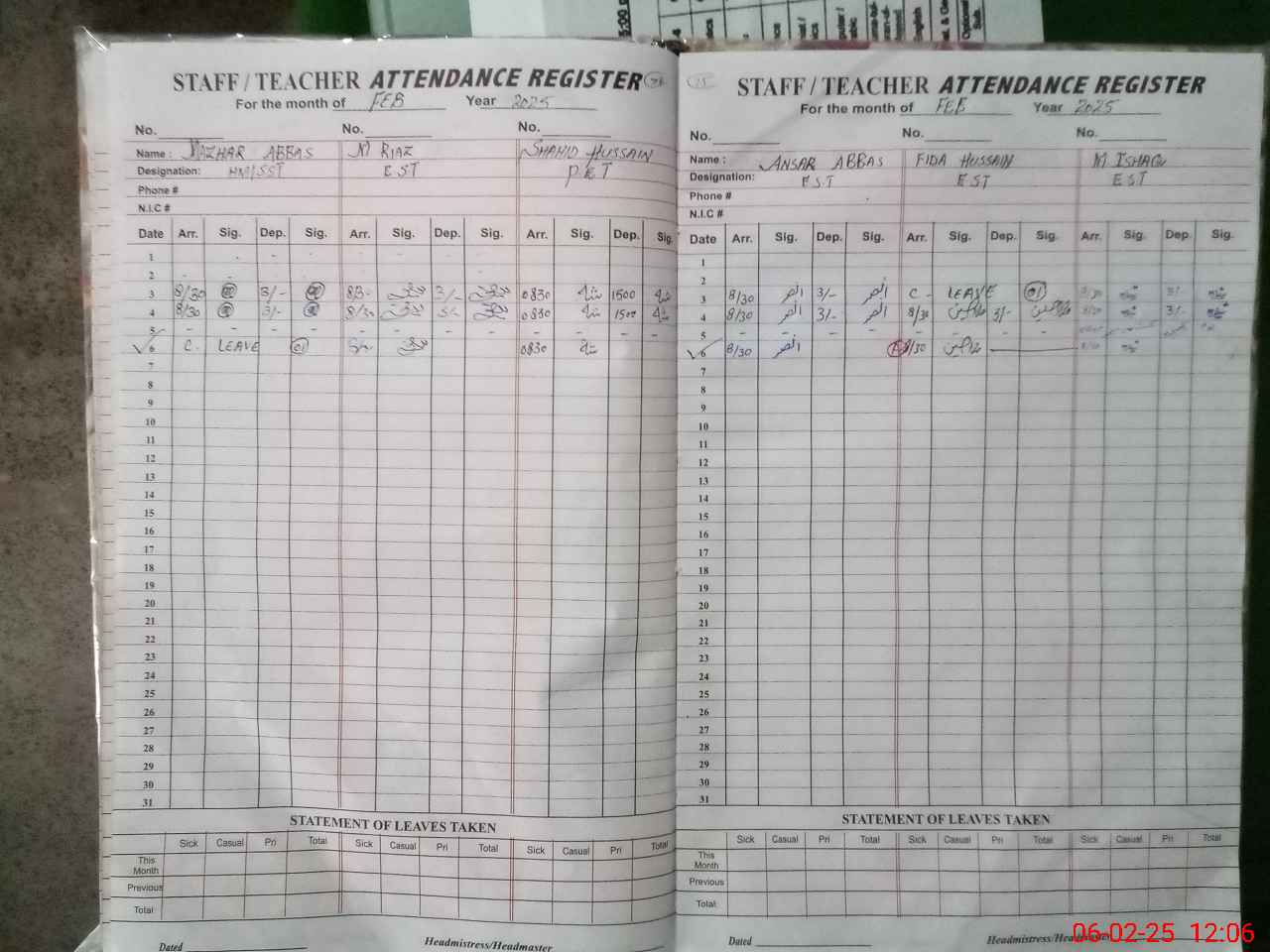 | CNIC | Full Name | Designation | R/C | Absence During Last Calender Month |