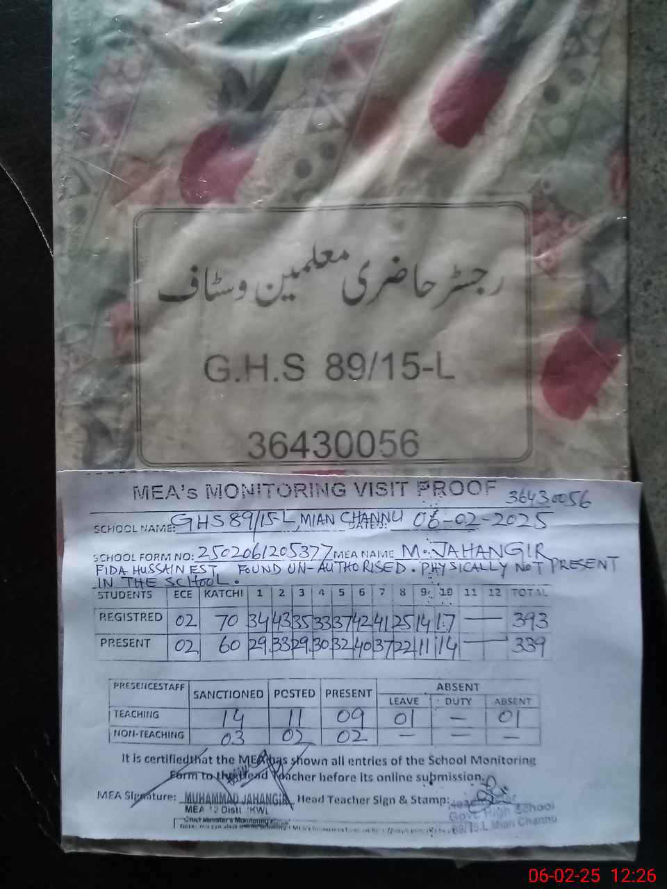 | EMIS Code: 36430056 | Name of School: GHS 89/15-L P/O 64/15-L, MIAN CHANNU | |||