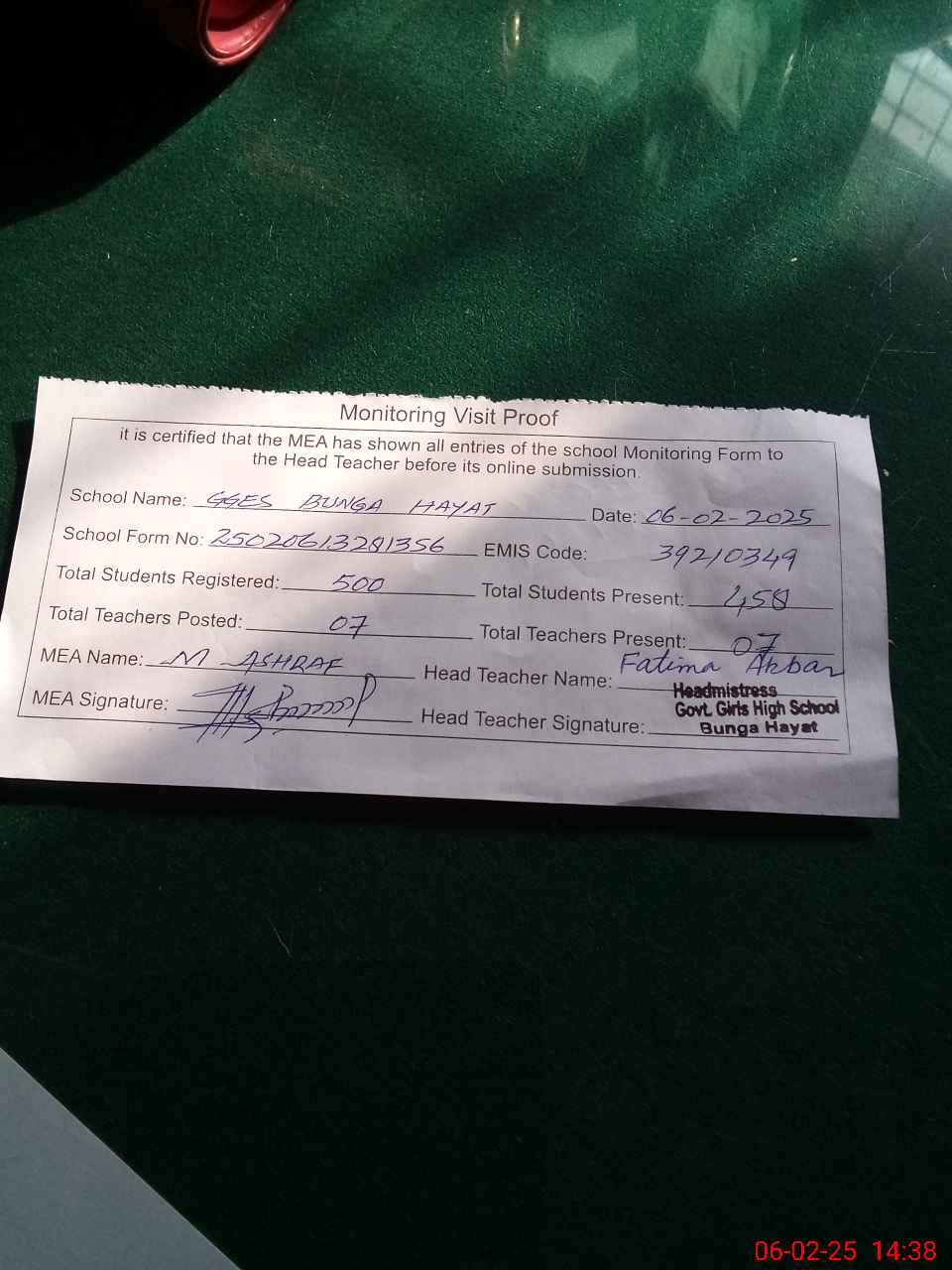 | Attendance Register | Head Teacher | MEA with School | Visit Proof |