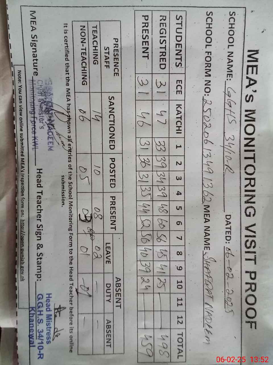 | EMIS Code: 36420115 | Name of School: GGHS 34/10-R, KACHA KHUH | |||