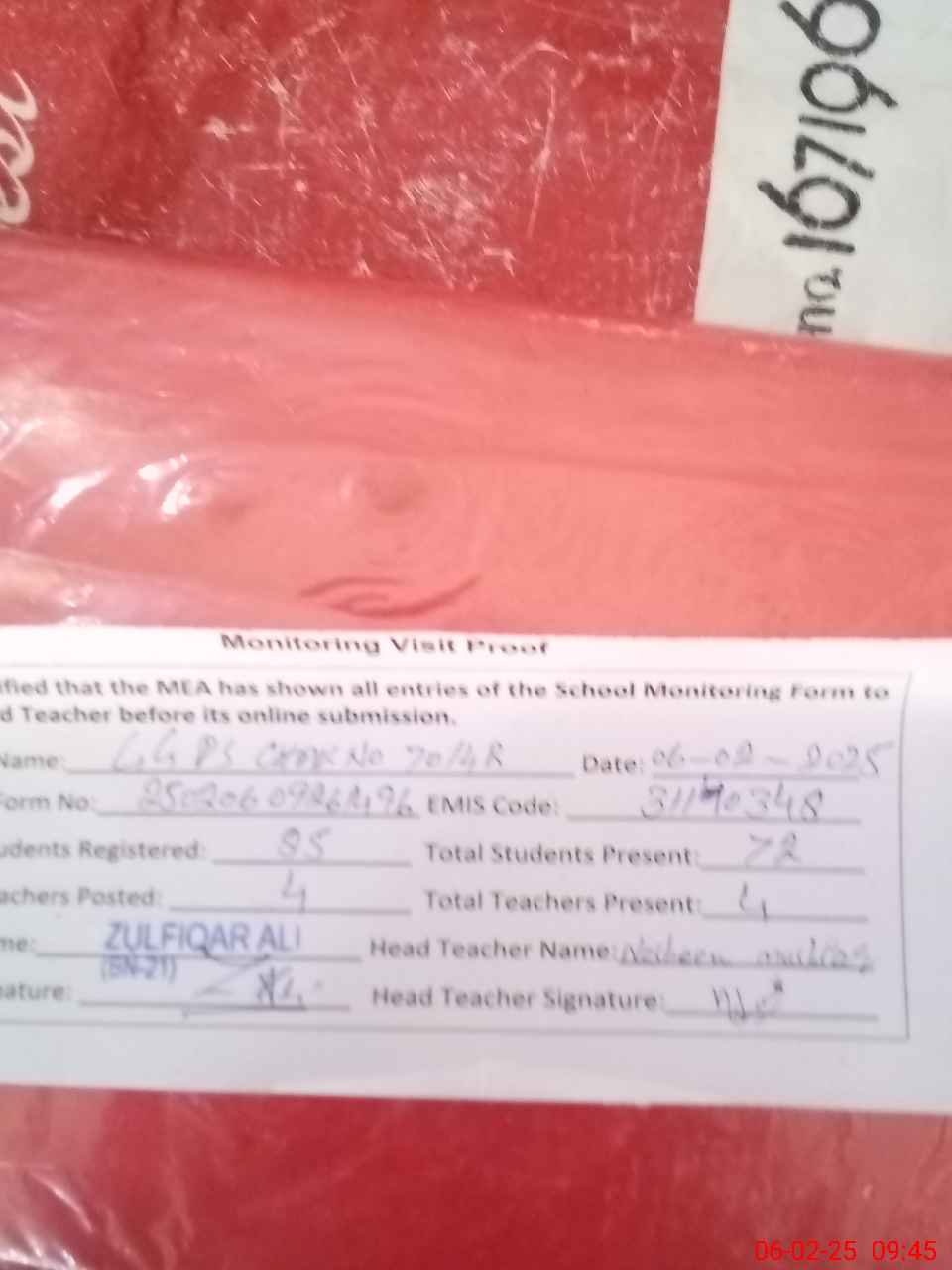 | Attendance Register | Head Teacher | MEA with School | Visit Proof |