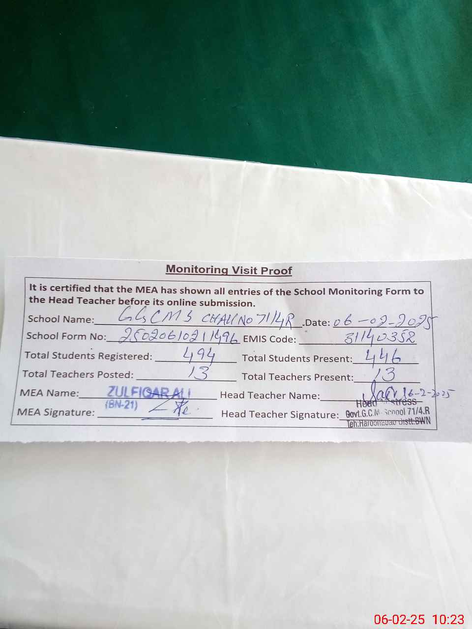 | Attendance Register | Head Teacher | MEA with School | Visit Proof |