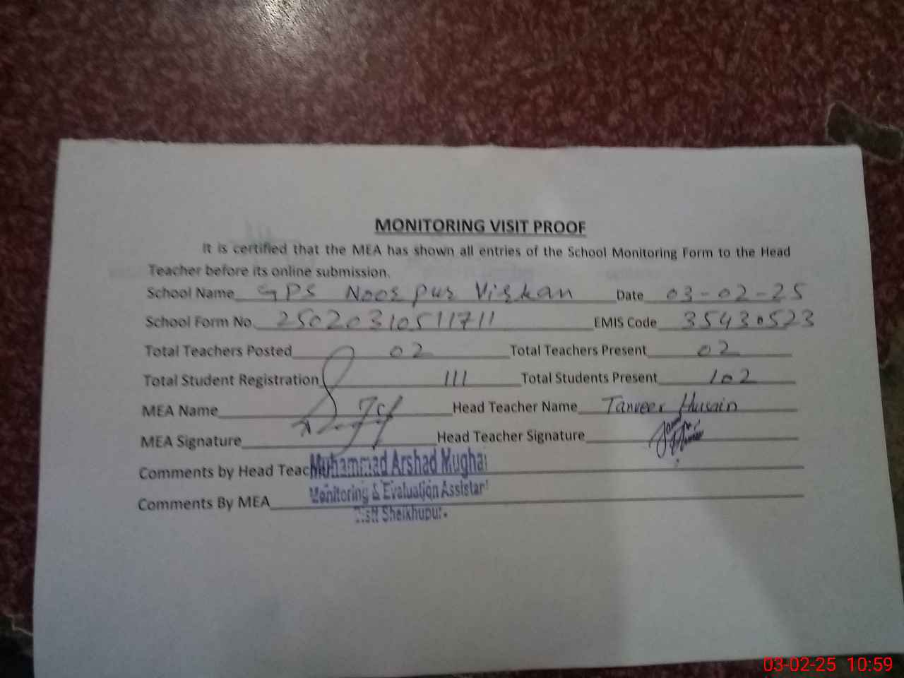 | Attendance Register | Head Teacher | MEA with School | Visit Proof |