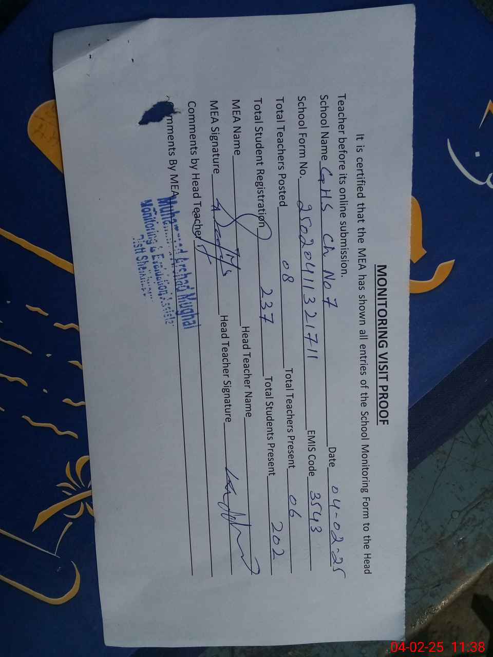 | Attendance Register | Head Teacher | MEA with School | Visit Proof |