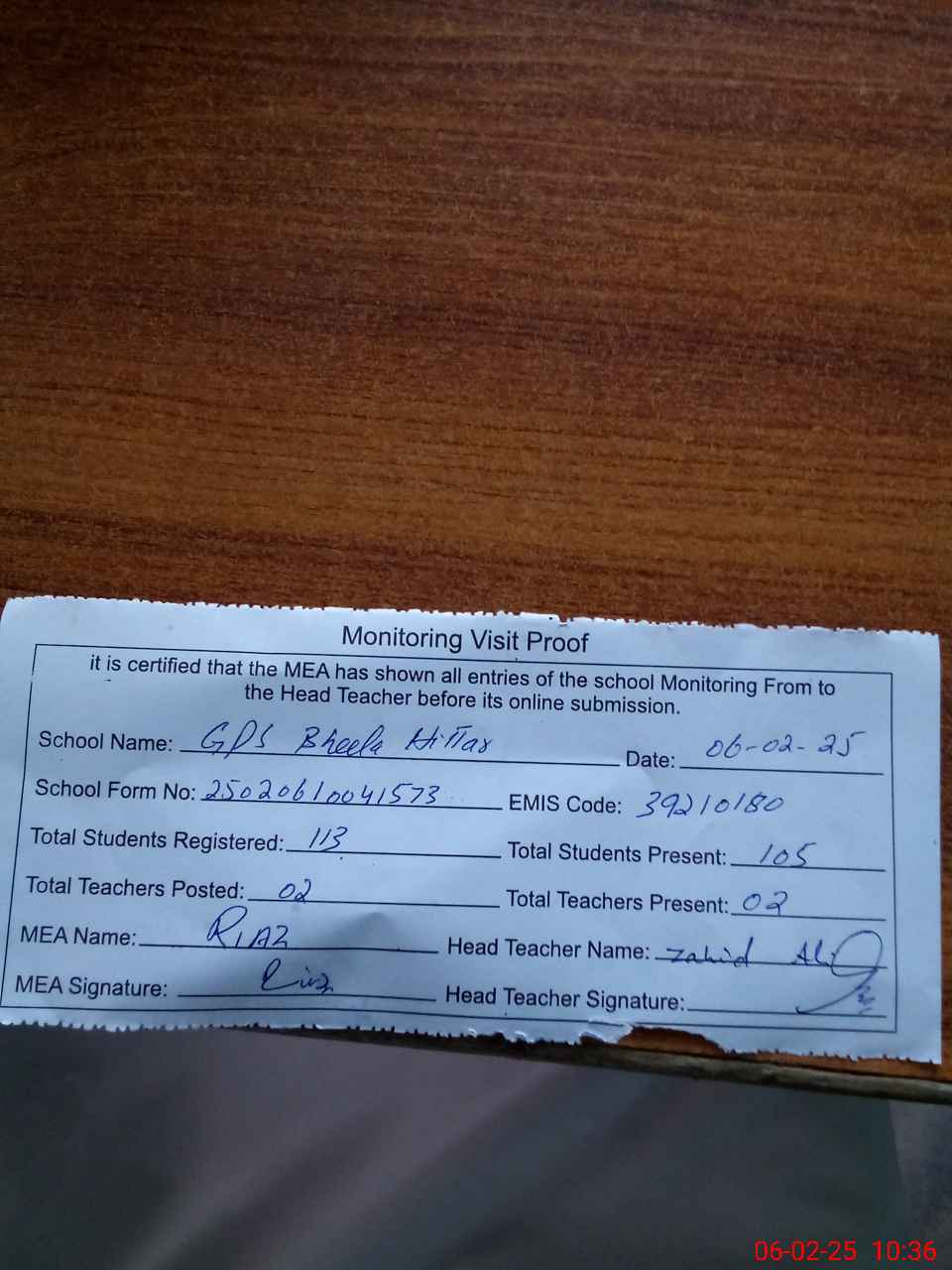 | Attendance Register | Head Teacher | MEA with School | Visit Proof |