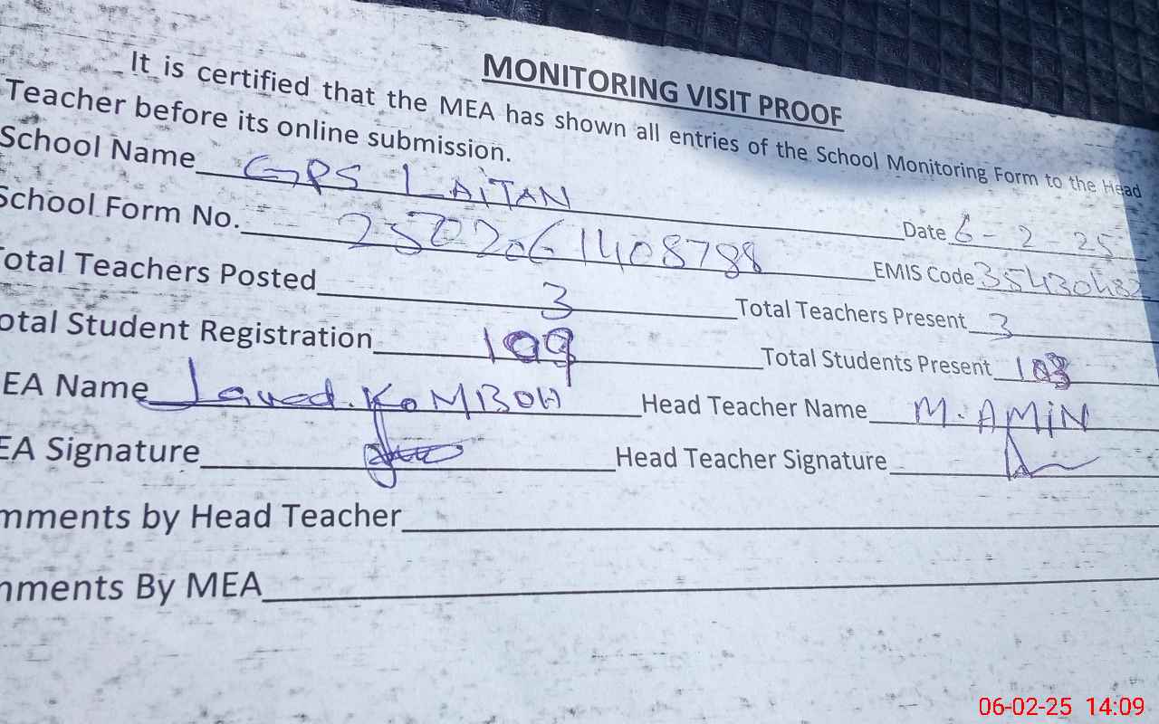 | Attendance Register | Head Teacher | MEA with School | Visit Proof |