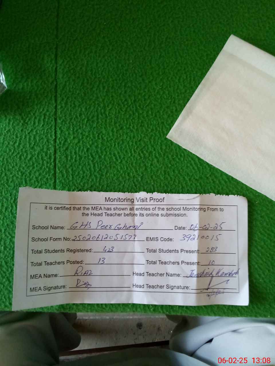 | EMIS Code: 39210015 | Name of School: GHS PEER GHANI | |||