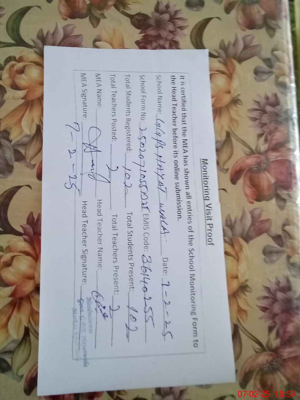 | Certified that this School was Inspected by the Undersigned MEA/DMO Today and the Information Stated Above is as Per Record. | |||||