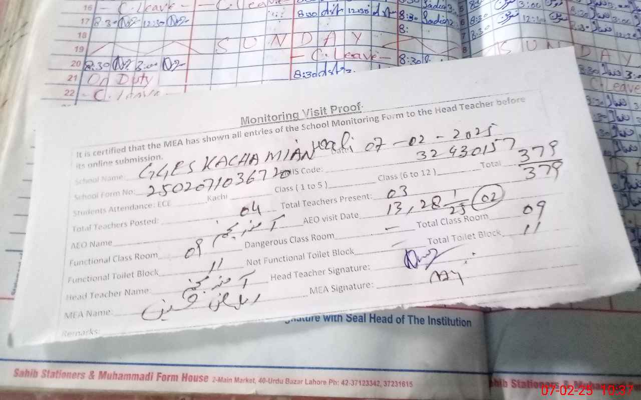 | EMIS Code: 32430157 | Name of School: GGES KACHA MIAN WALI | |||