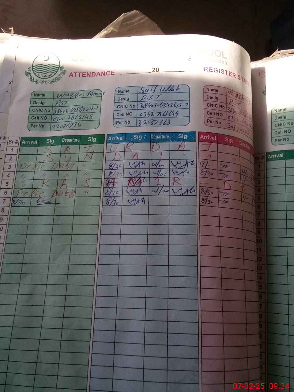 | CNIC | Full Name | Designation | R/C | Absence during last cal. month |