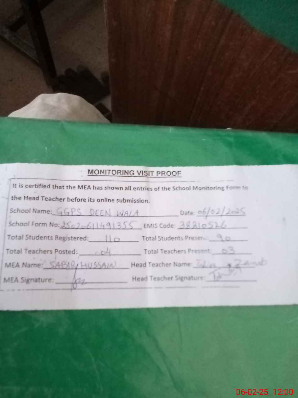 | EMIS Code: 38210526 | Name of School: GGPS DEEN WALA | |||