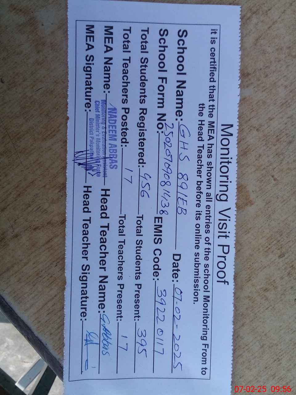 | Attendance Register | Head Teacher | MEA with School | Visit Proof |