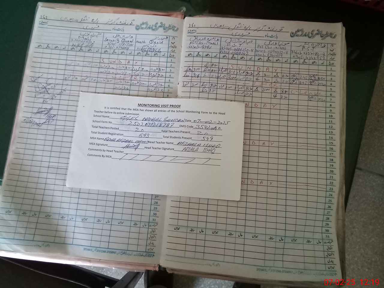 | Attendance Register | Head Teacher | MEA with School | Visit Proof |