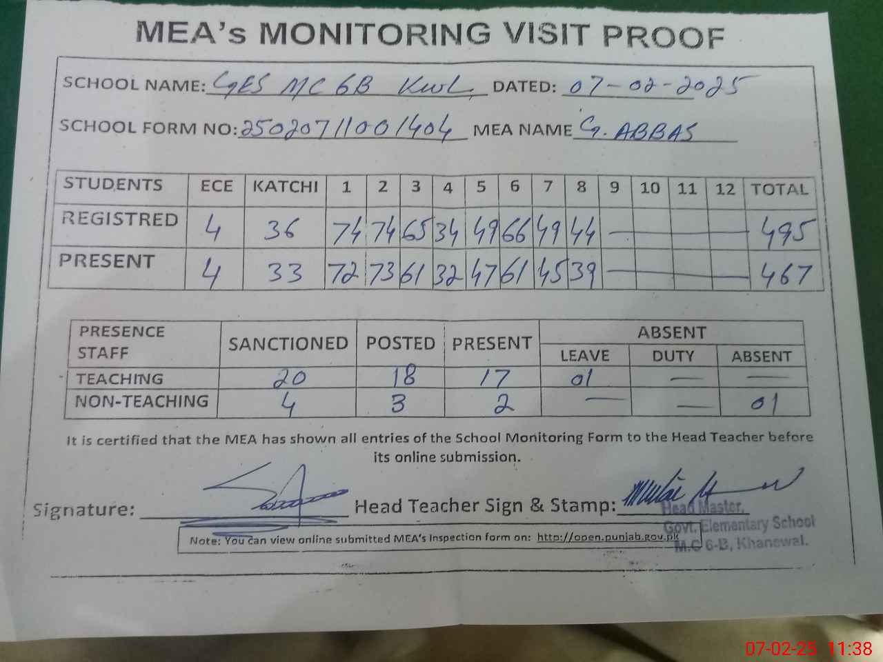 | Attendance Register | Head Teacher | MEA with School | Visit Proof |