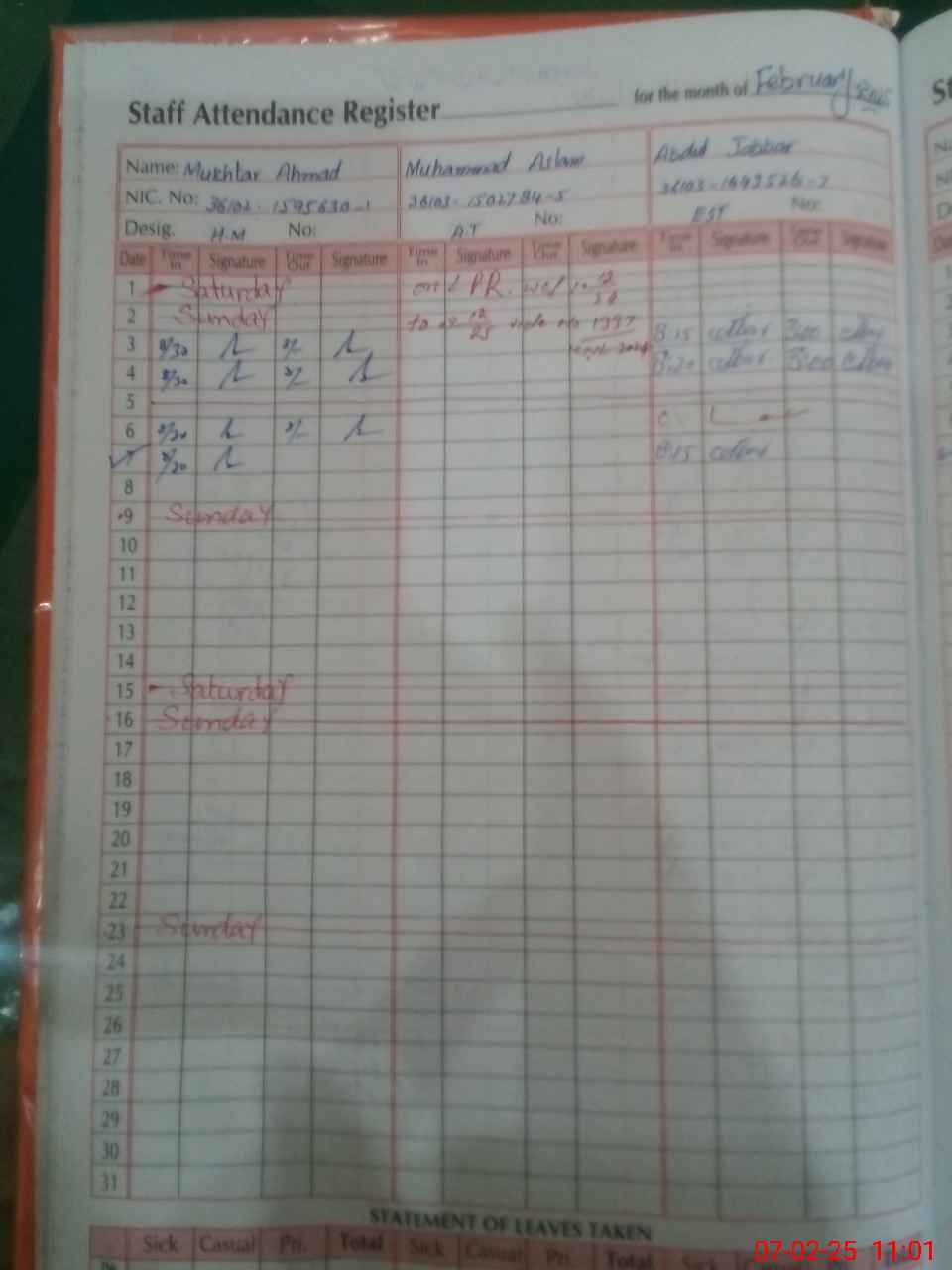 | CNIC | Full Name | Designation | R/C | Absence During Last Calender Month |
