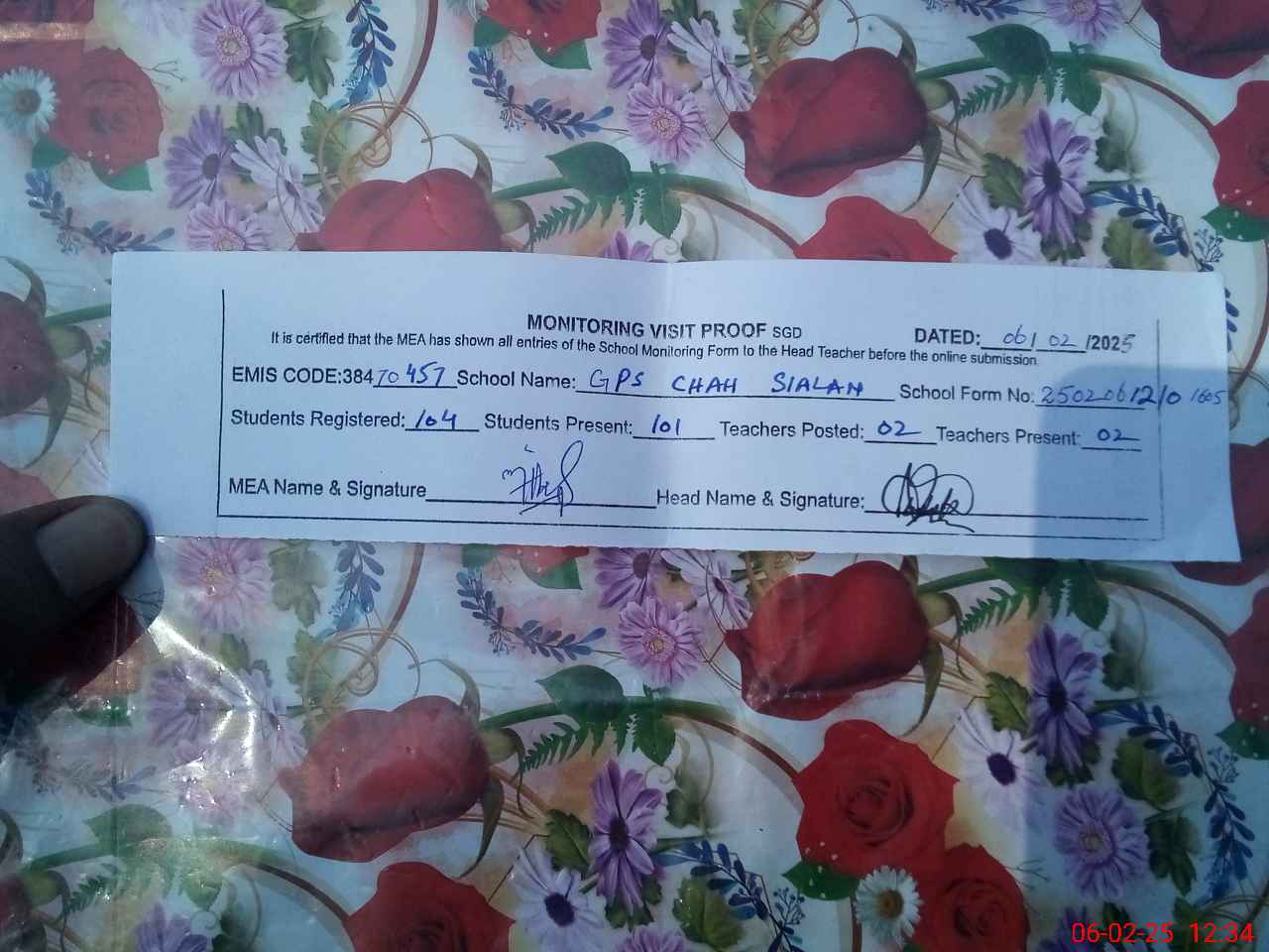 | Attendance Register | Head Teacher | MEA with School | Visit Proof |