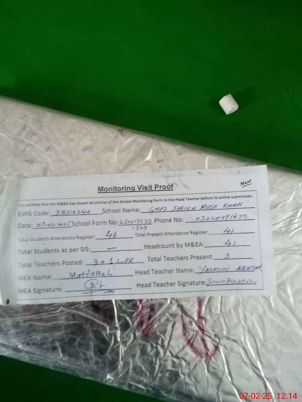 | EMIS Code: 38310240 | Name of School: GMPS SHEIKH MUSA KHEL | |||