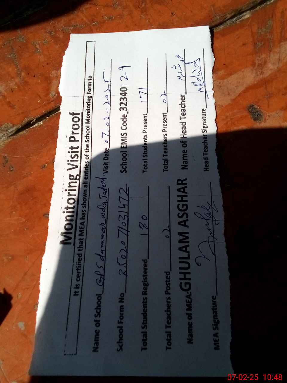 | Attendance Register | Head Teacher | MEA with School | Visit Proof |
