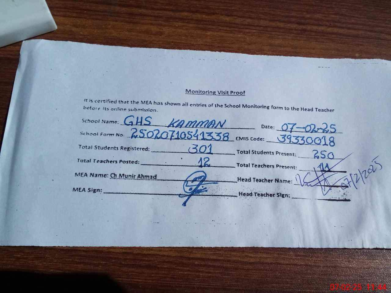 | Attendance Register | Head Teacher | MEA with School | Visit Proof |