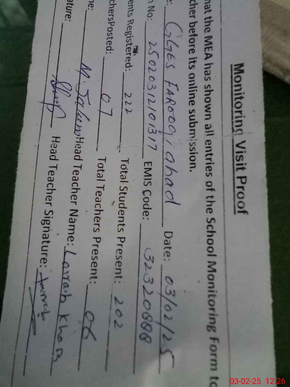 | Attendance Register | Head Teacher | MEA with School | Visit Proof |