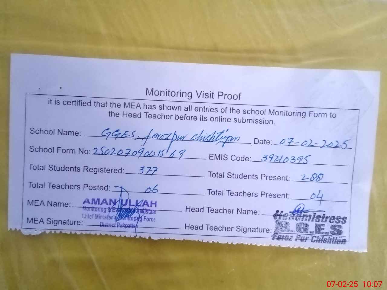 | Attendance Register | Head Teacher | MEA with School | Visit Proof |