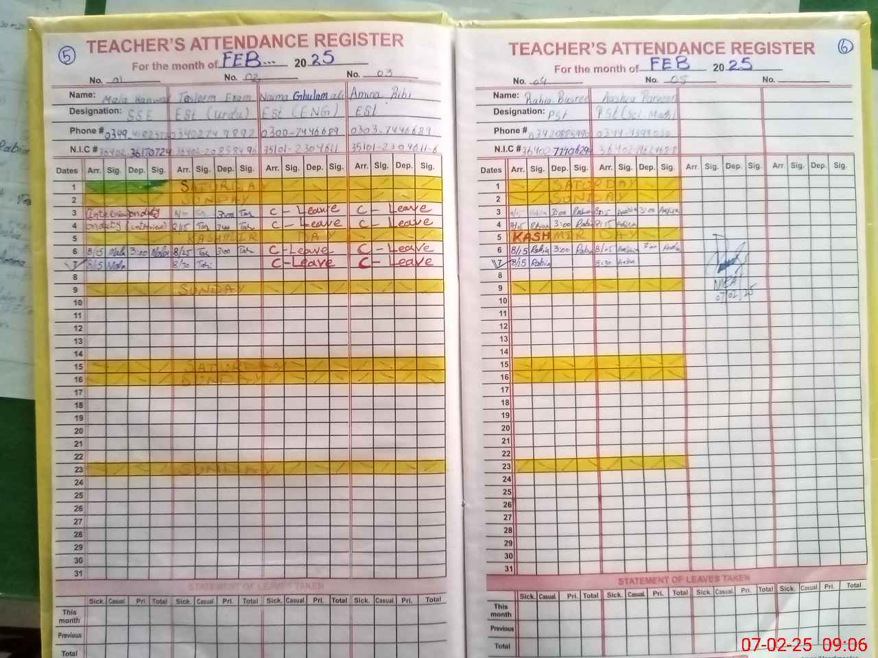| CNIC | Full Name | Designation | R/C | Absence During Last Calender Month |