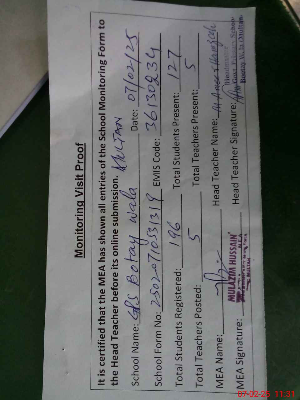 | Attendance Register | Head Teacher | MEA with School | Visit Proof |