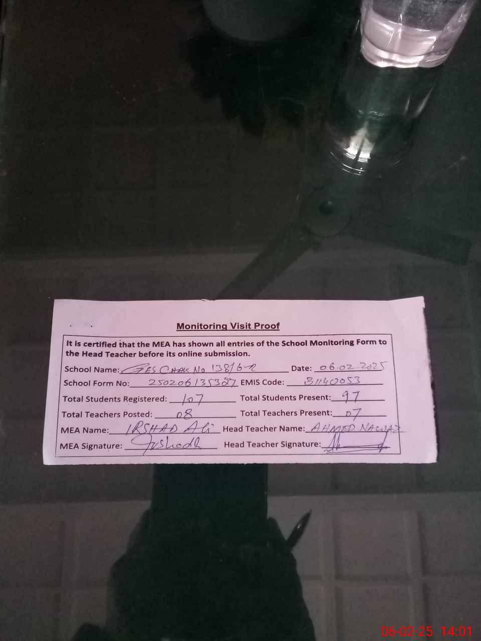| Attendance Register | Head Teacher | MEA with School | Visit Proof |