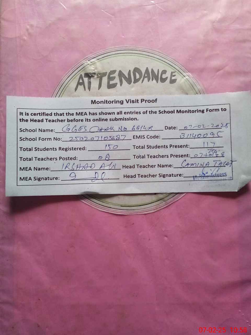 | Attendance Register | Head Teacher | MEA with School | Visit Proof |