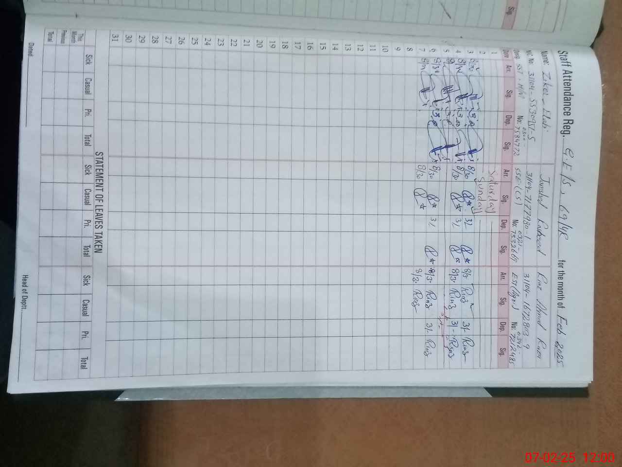 | CNIC | Full Name | Designation | R/C | Absence During Last Calender Month |