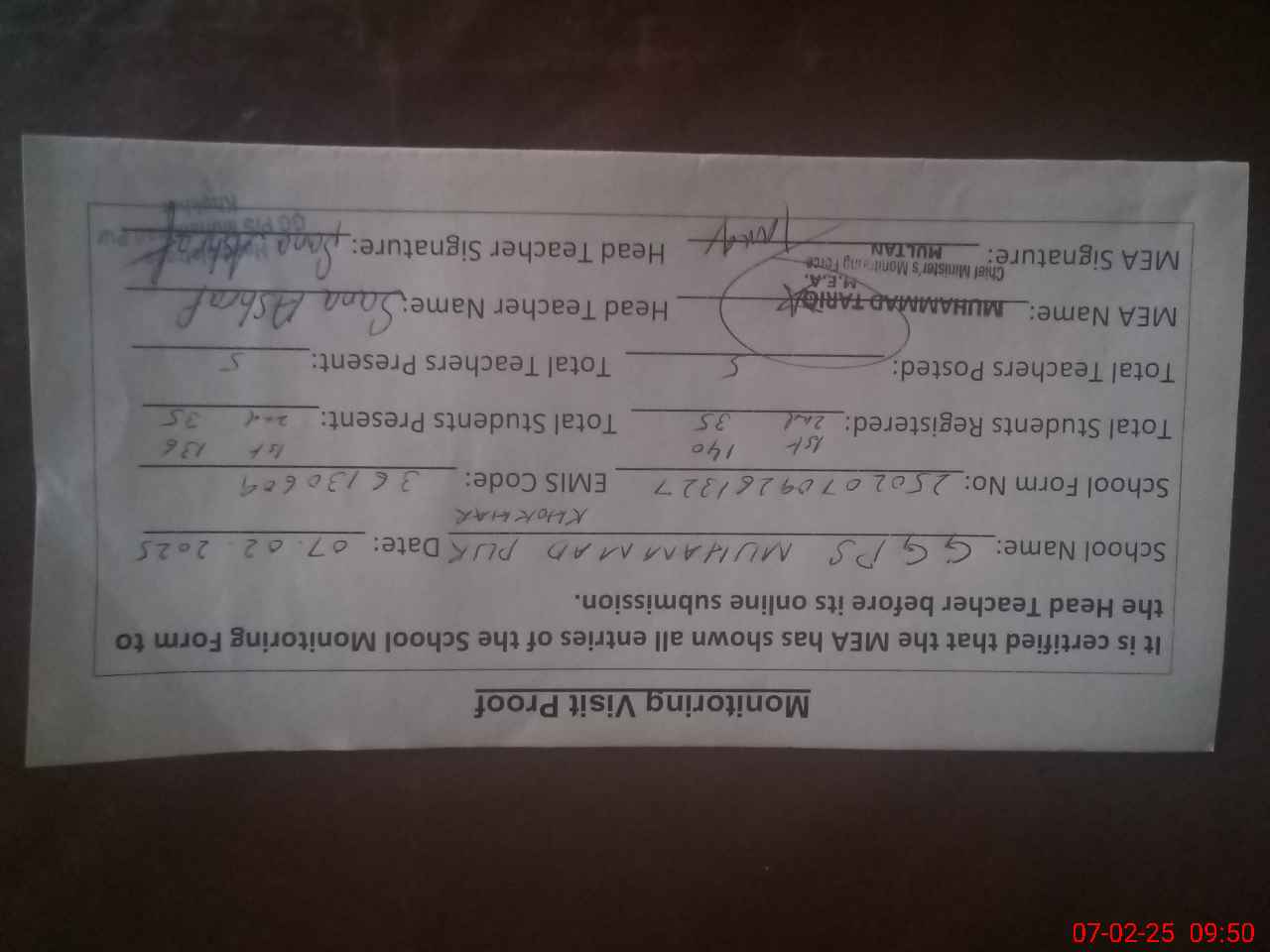 | Certified that this School was Inspected by the Undersigned MEA/DMO Today and the Information Stated Above is as Per Record. | |||||