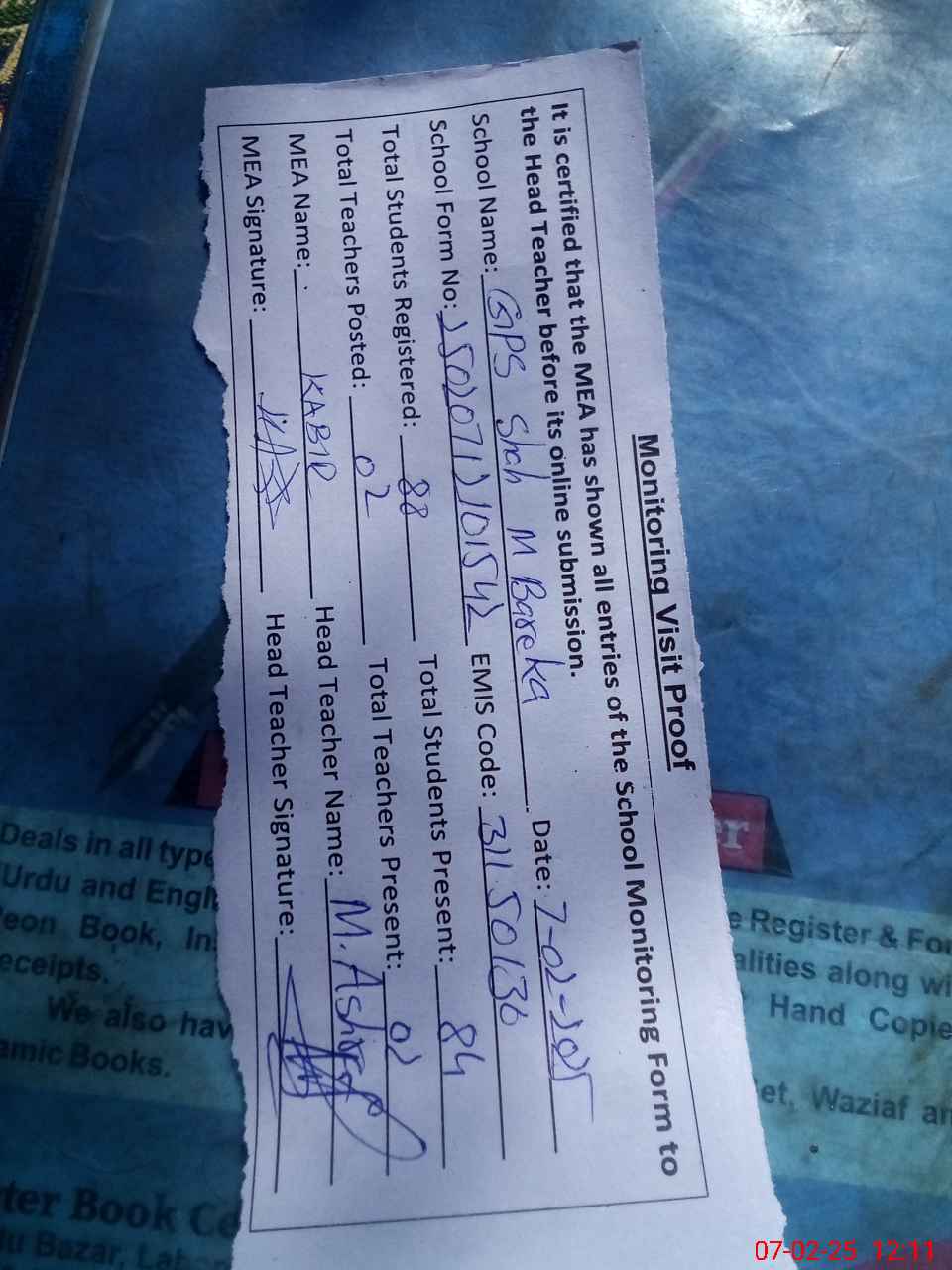 | Attendance Register | Head Teacher | MEA with School | Visit Proof |