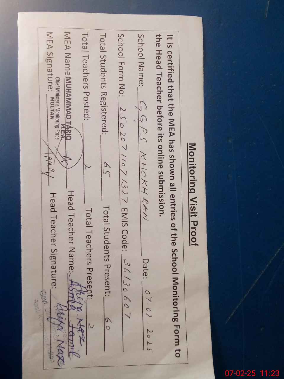 | Attendance Register | Head Teacher | MEA with School | Visit Proof |