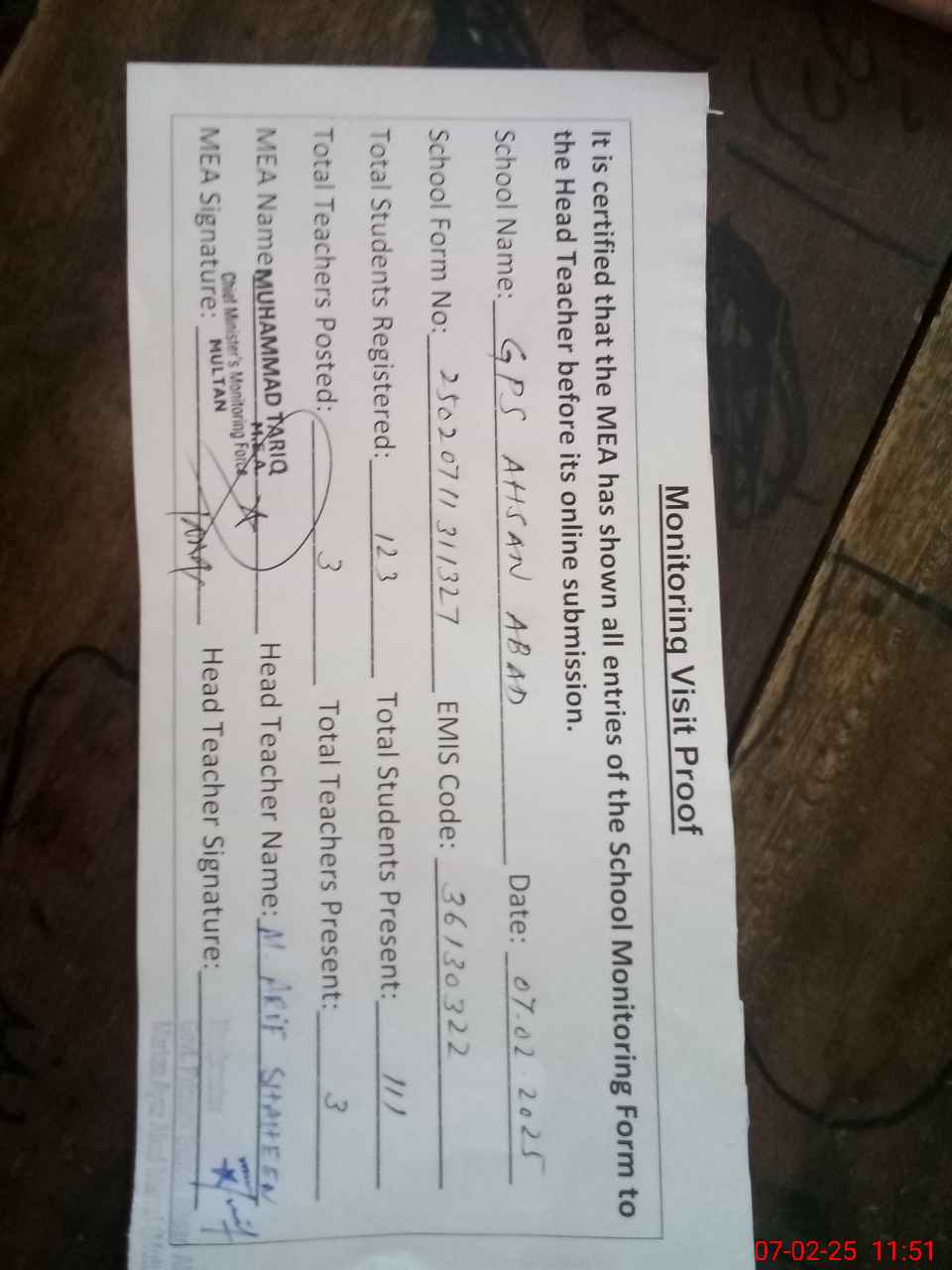 | EMIS Code: 36130322 | Name of School: GPS AHSAN ABAD | |||