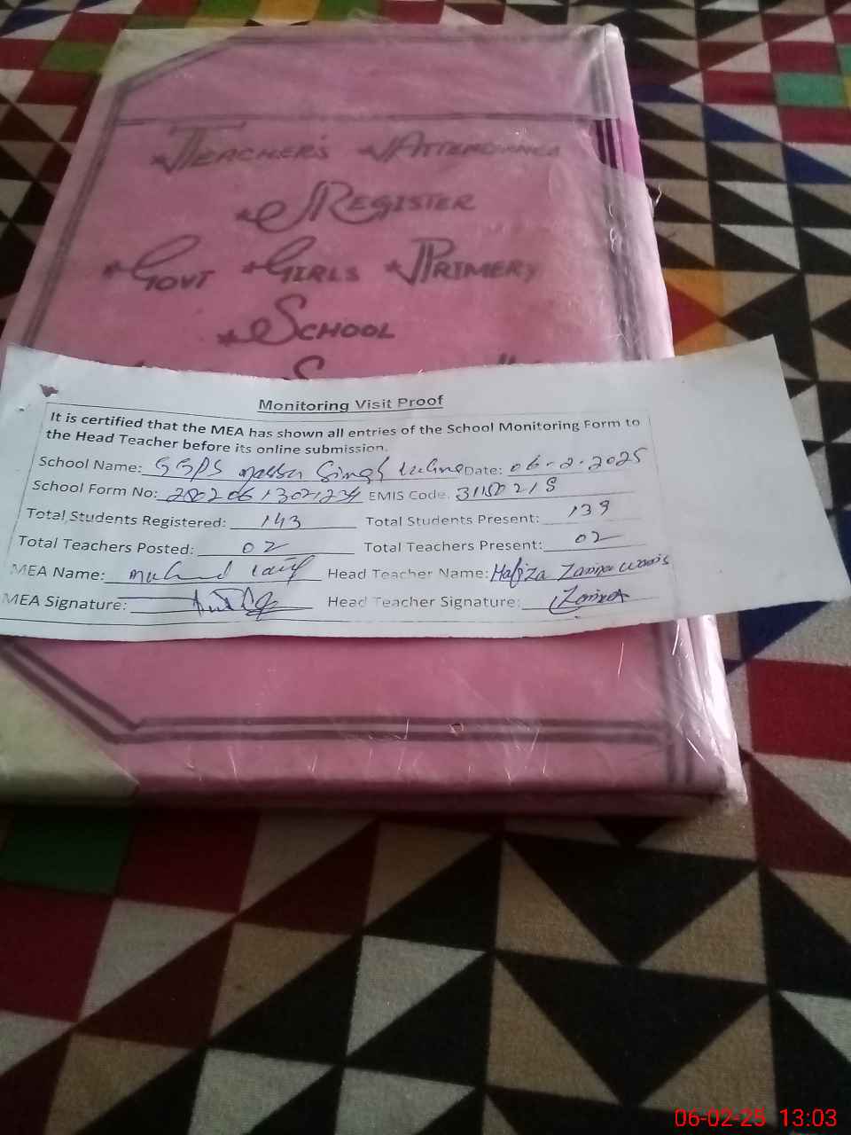 | Attendance Register | Head Teacher | MEA with School | Visit Proof |