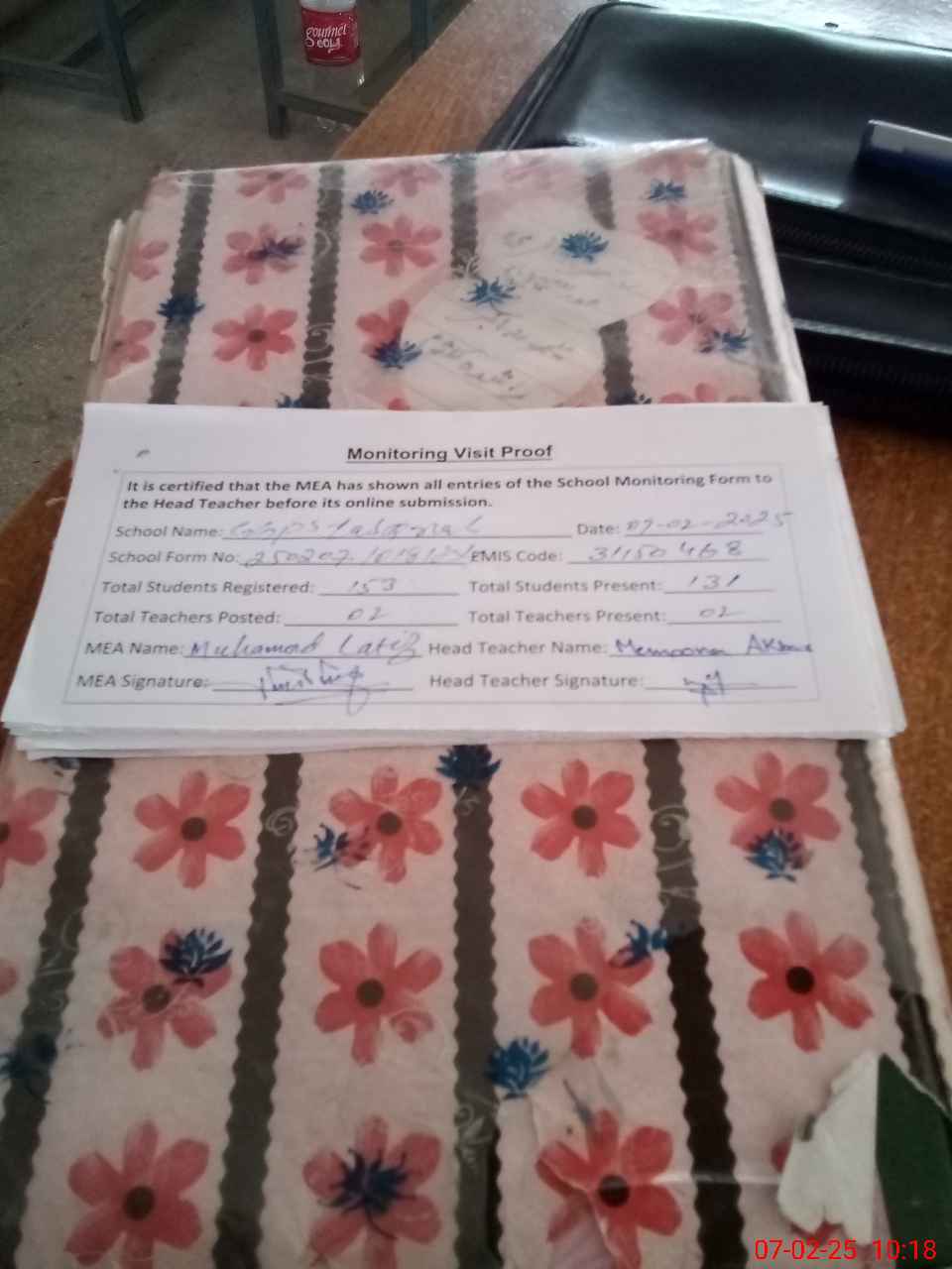| Attendance Register | Head Teacher | MEA with School | Visit Proof |