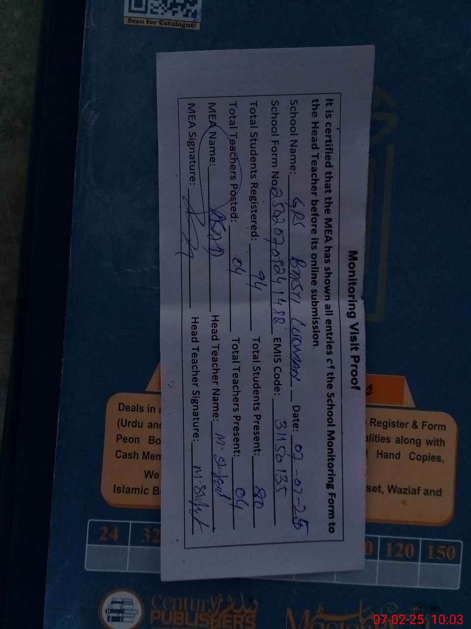 | Attendance Register | Head Teacher | MEA with School | Visit Proof |