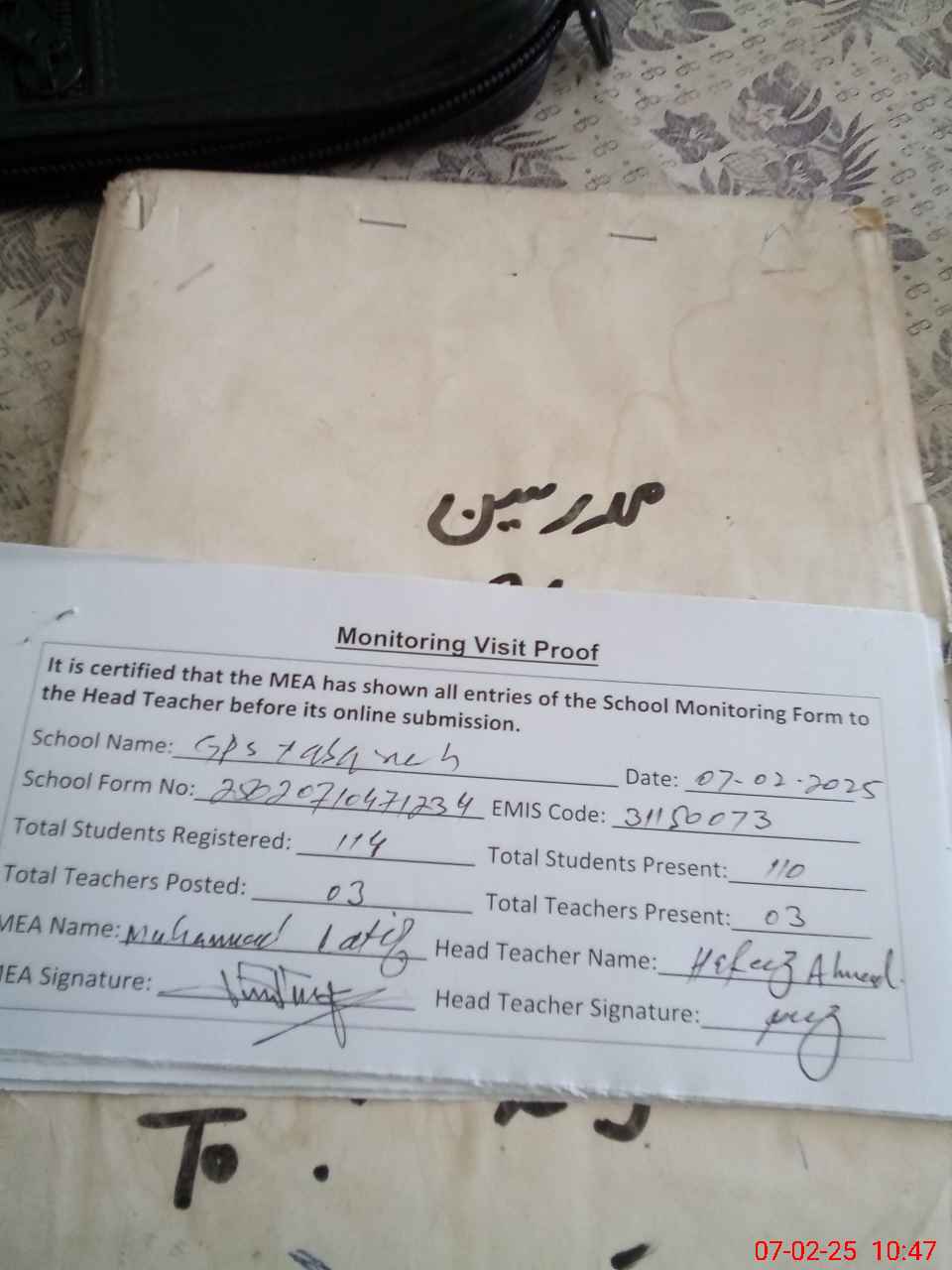| Attendance Register | Head Teacher | MEA with School | Visit Proof |