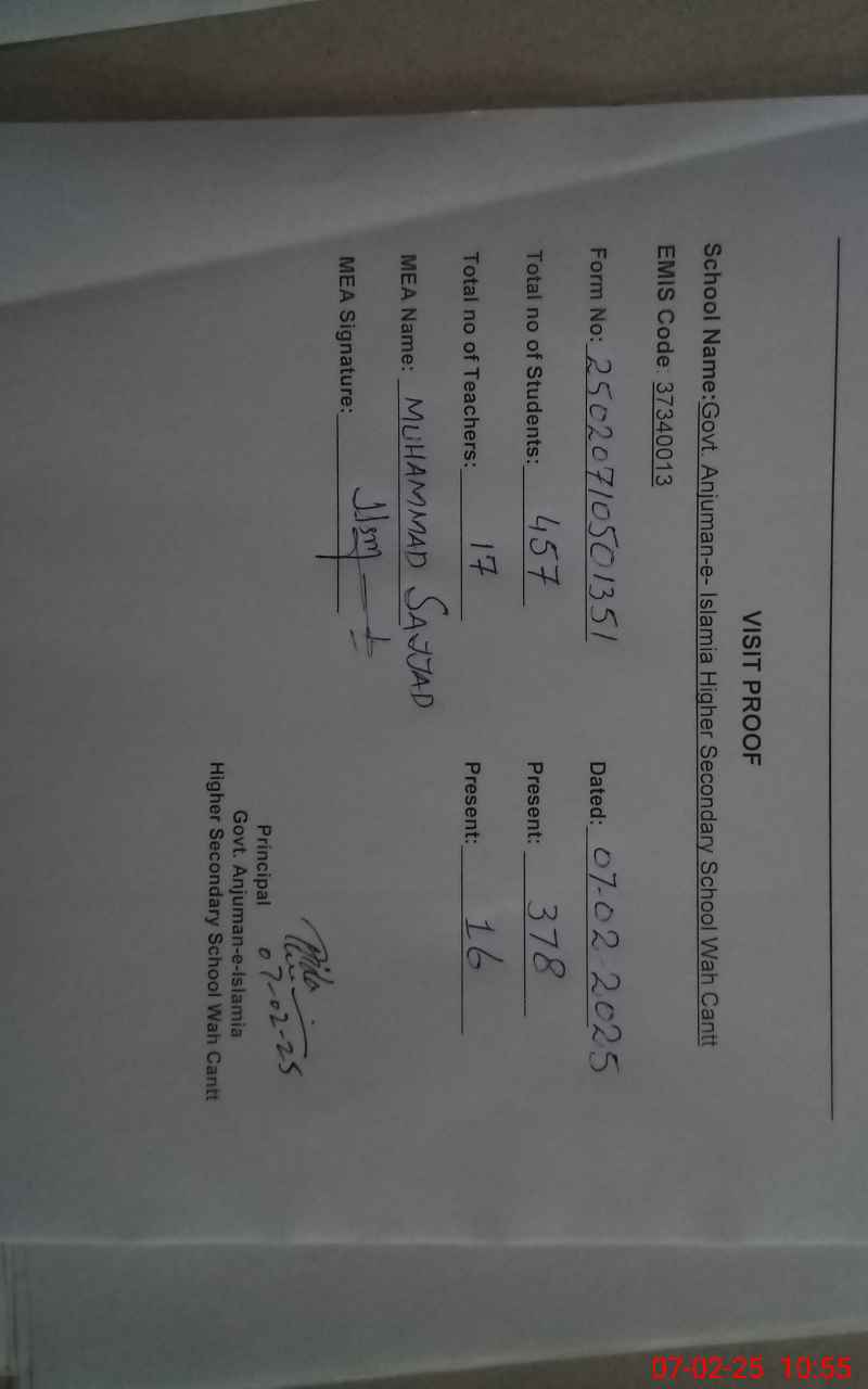 | EMIS Code: 37340013 | Name of School: GHSS ANJUMAN-E-ISLAM WAH CANTT | |||