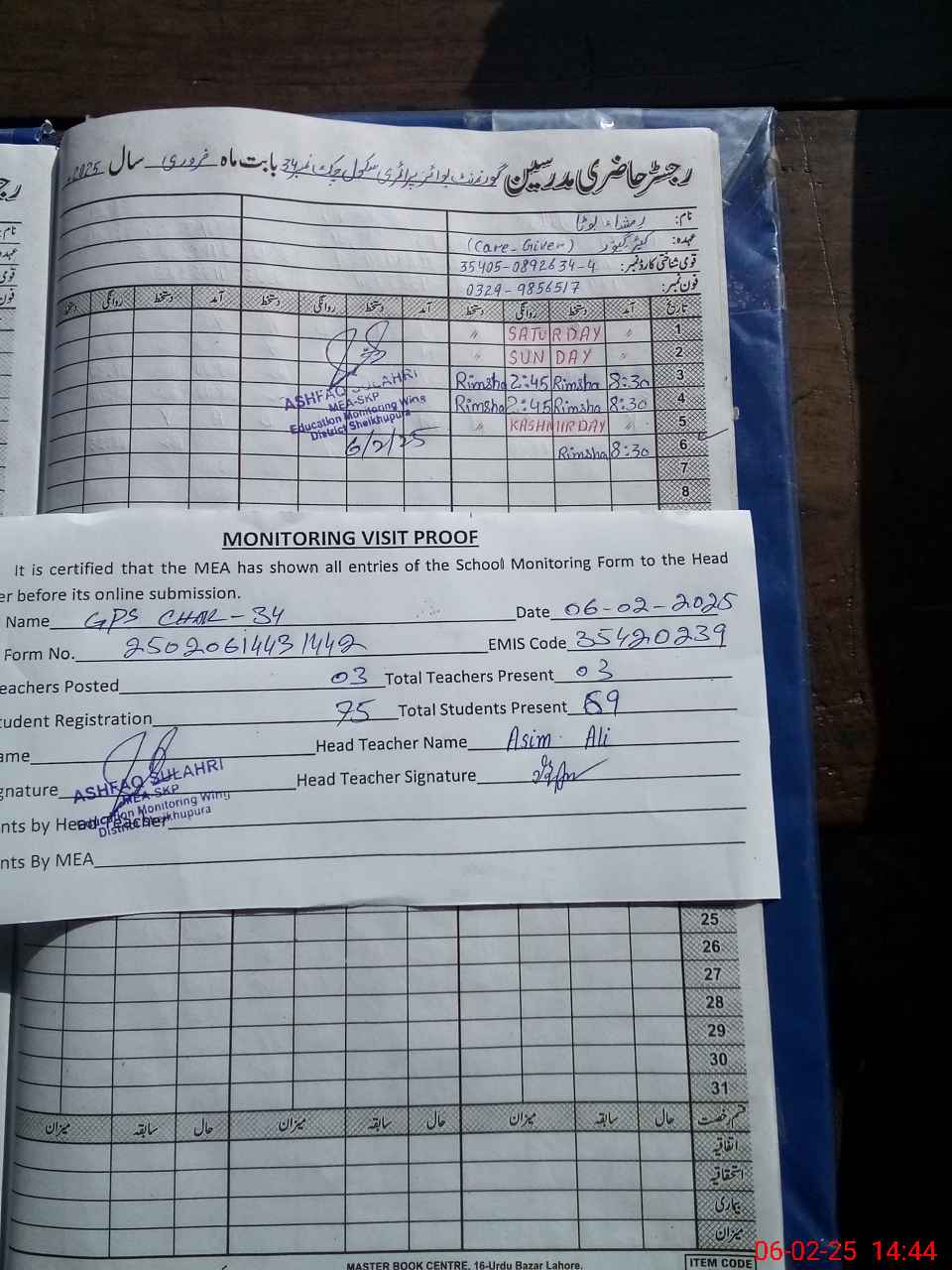 | Attendance Register | Head Teacher | MEA with School | Visit Proof |
