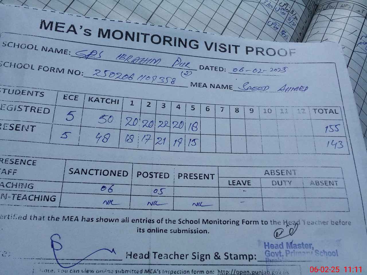 | Attendance Register | Head Teacher | MEA with School | Visit Proof |