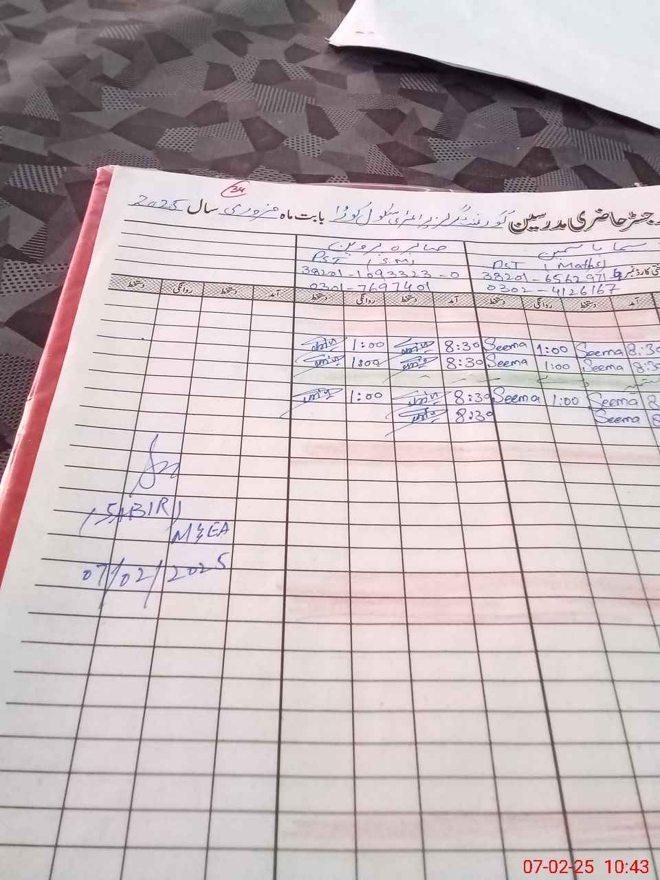 | Name: Za**** Pa**** Bh**** Designation: (School Headmaster's/Headmistress's) Est (V) Phone/Cell Number: 03**** |