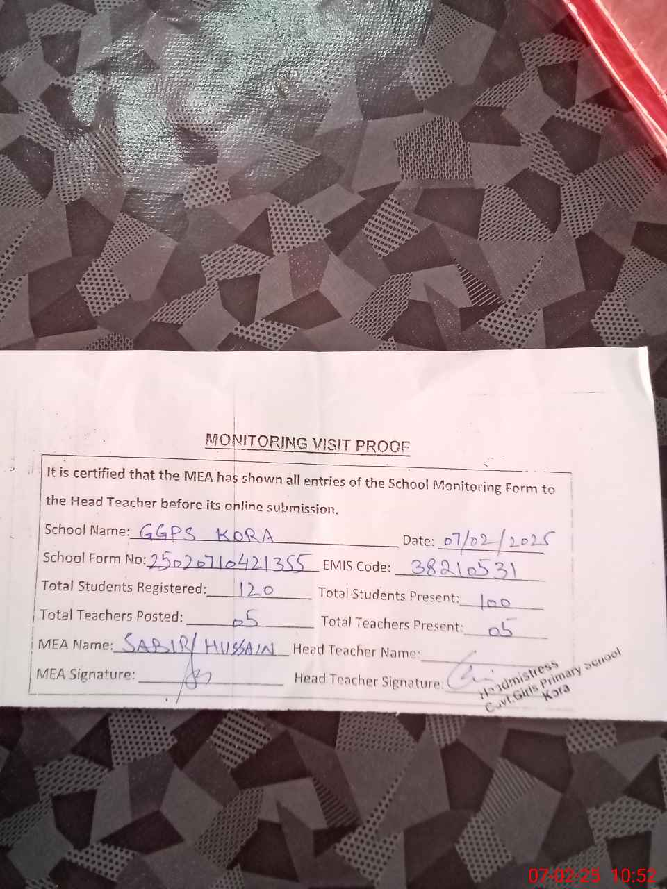 | Attendance Register | Head Teacher | MEA with School | Visit Proof |